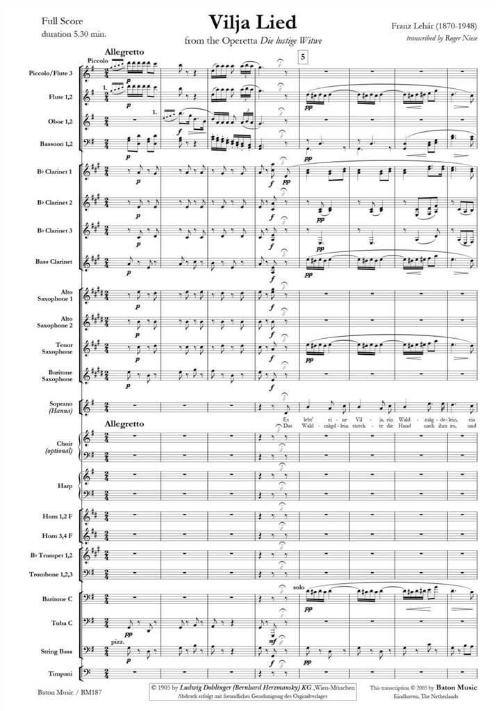 Franz Lehr was born in Komrom, Hungary on 30th April 1870. From the age of fifteen he received composition and violin lessons at the Prague conservatory from Anton n Dvork. In 1905 he composed The Merry Widow which became an instant worldwide success. The libretto of this operetta provides a succession of intimate arias and duets with festive ensembles. The Vilja-Lied is one of these arias. In this edition for concert band all the poignant beauty of the original remains.