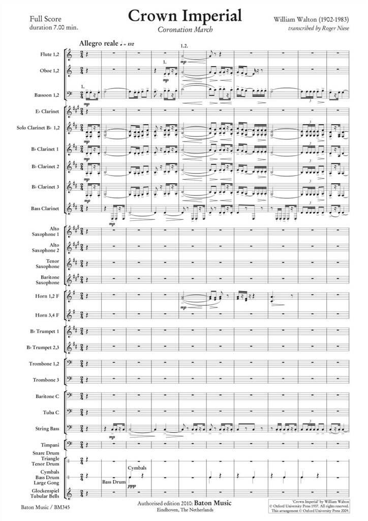 Crown Imperial: A Coronation March (1937) was composed for, and first performed at, the coronation service for King George VI in Westminster Abbey, London, on 12 May 1937 by the Coronation Orchestra, conducted by Sir Adrian Boult. It has been an important piece for the band repertoire for a number of years. This arrangement is intended to continue the legacy of a great piece for Concert/Wind Bands.